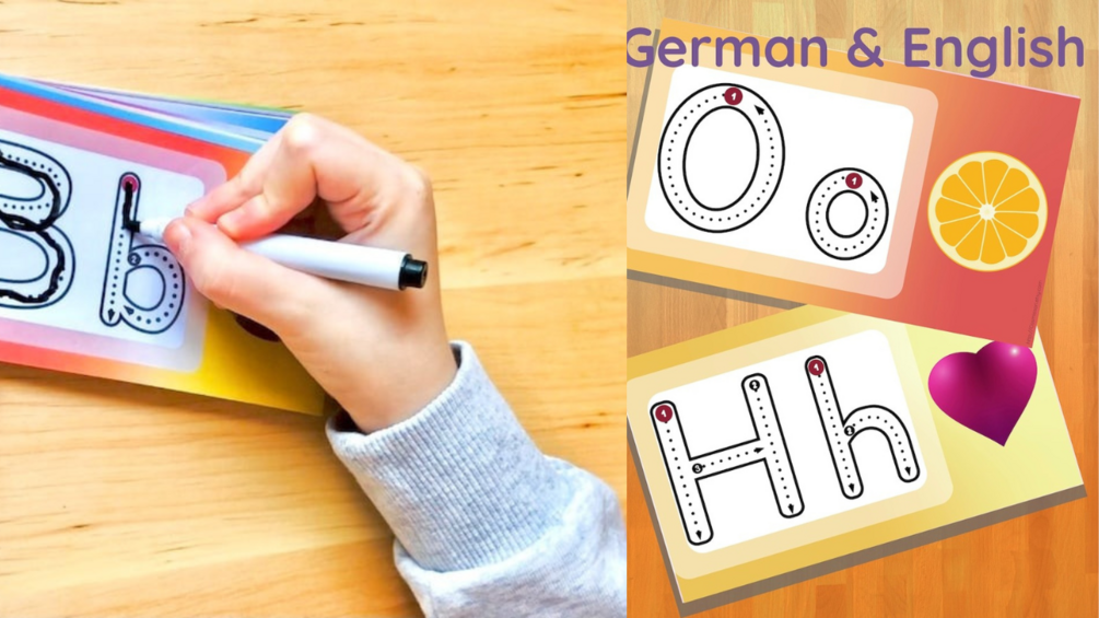 First writing ABC alphabet German tracing cards letters painting download swing exercise PDF template preschool worksheet children learning